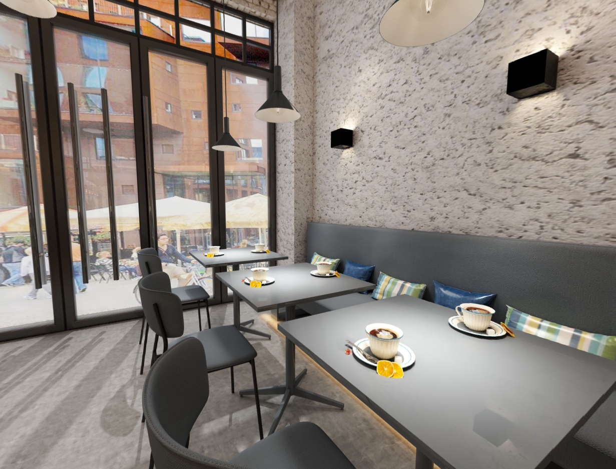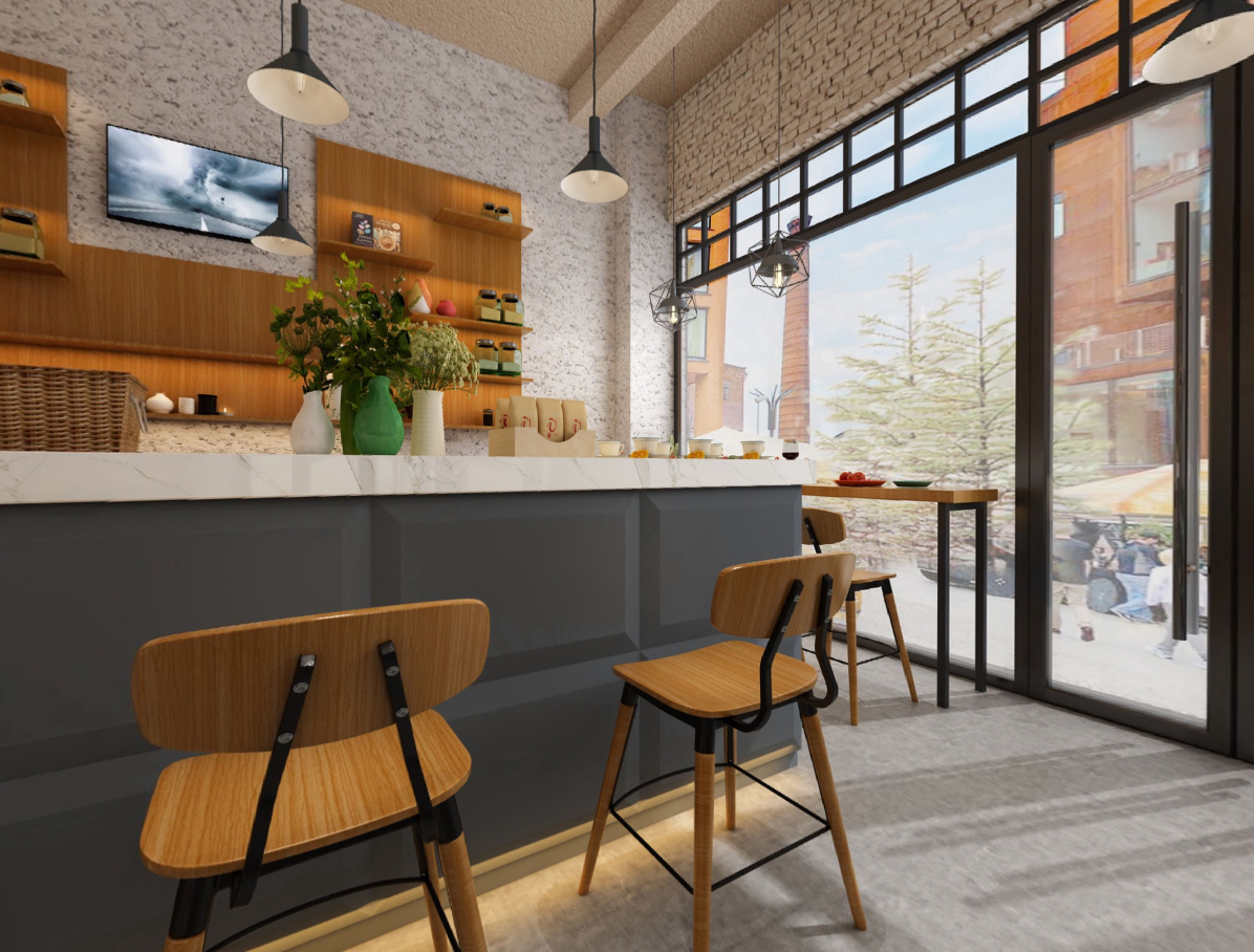 场地位于商场的转角,方形平面的一折为玻璃幕墙,分出室内与室外,室外的草木林荫以借景的方式借入“园”内,亦成为园景的延伸。商场地下出入口上来,转而折入“游廊”,游廊中粉墙隔立,漏以重重门洞和窗洞,将无处不在的景致通过框景纳入观者的视线。空间内每一个角落看出去都如同一幅园林画,人在动,景亦在变,人和物,互为画中景。