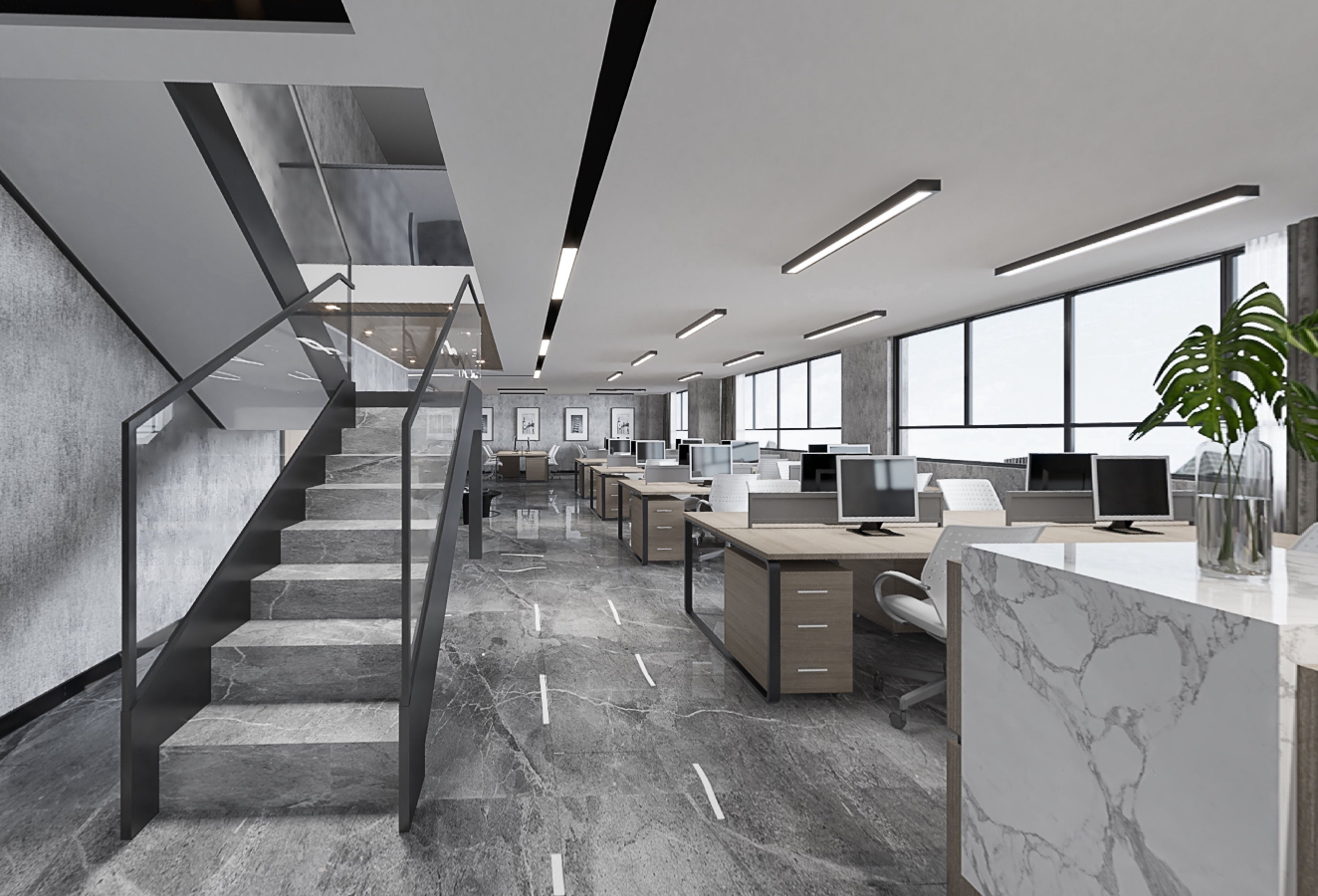 前厅环境以灰白色为主,灯线的设计则立体感很强,灯光设计成为空间架构的多道主脊,形成光影流转的效果,这种设计效果给人的视觉感官体验是非同一般的。