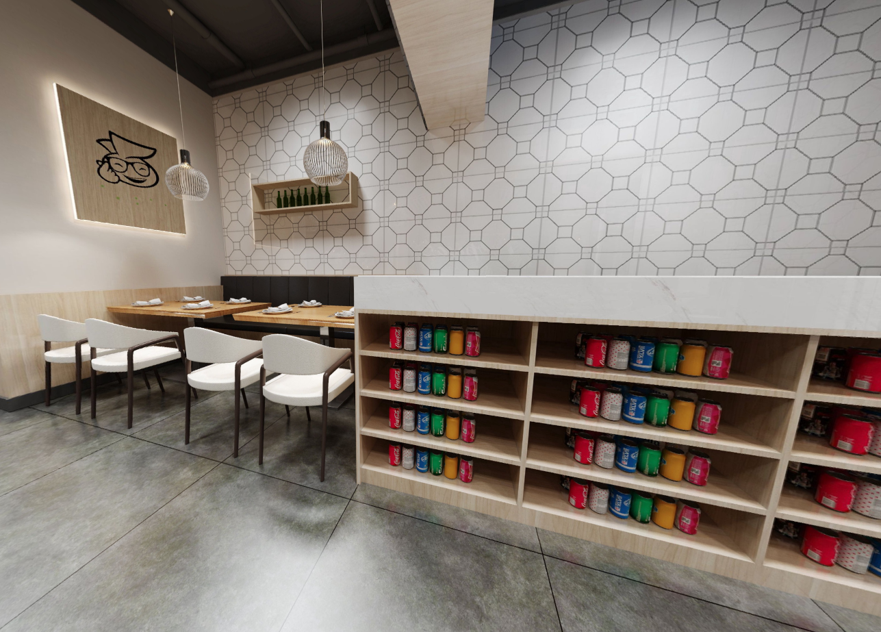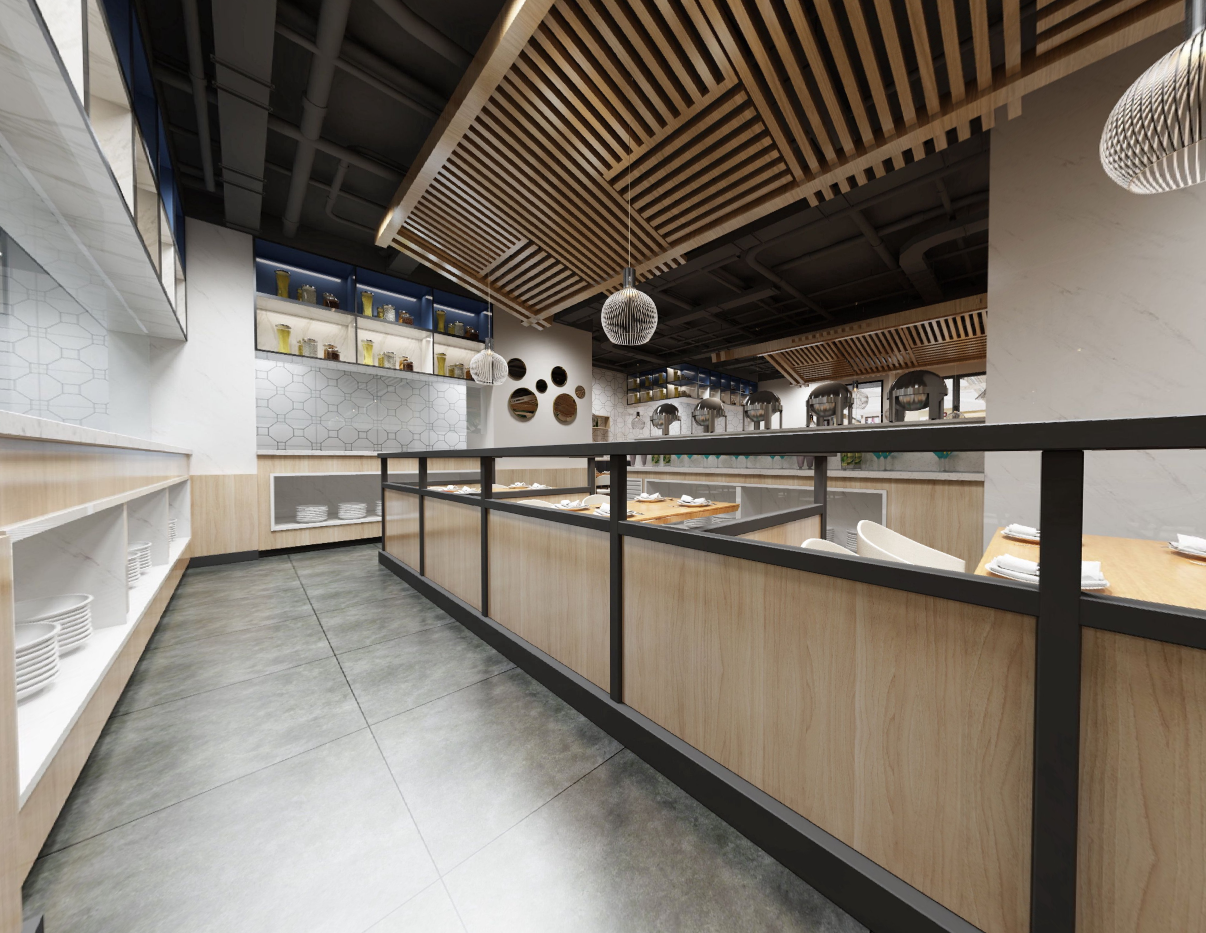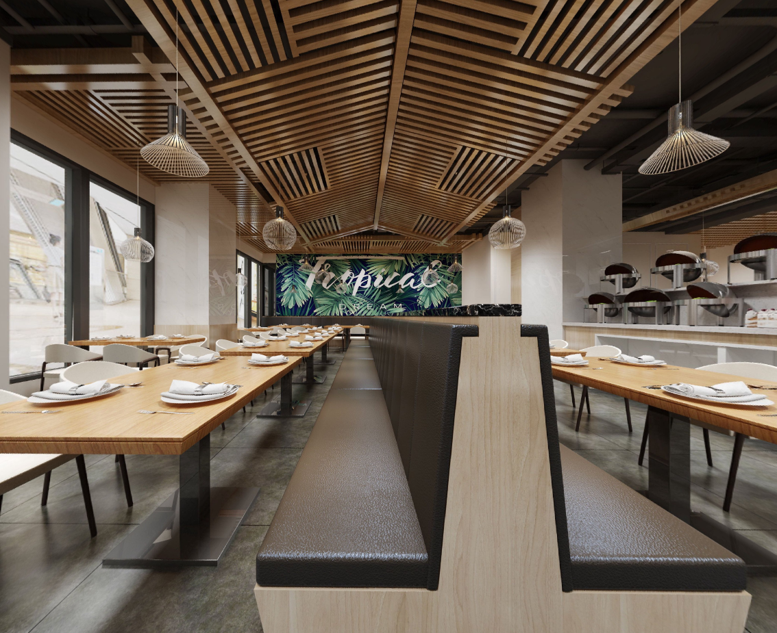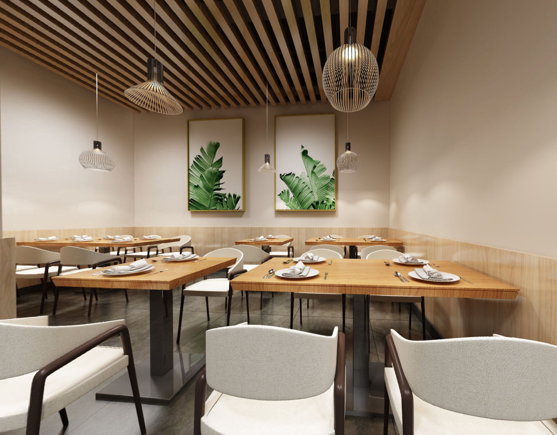 设计的风格要求现代简约、亮色调。我们从现在客人所追求的生态健康理念出发,使用了浅色原木质感搭配高雅中性灰,融入东南亚休闲干净的色彩,打造简约、时尚、温馨的就餐氛围。