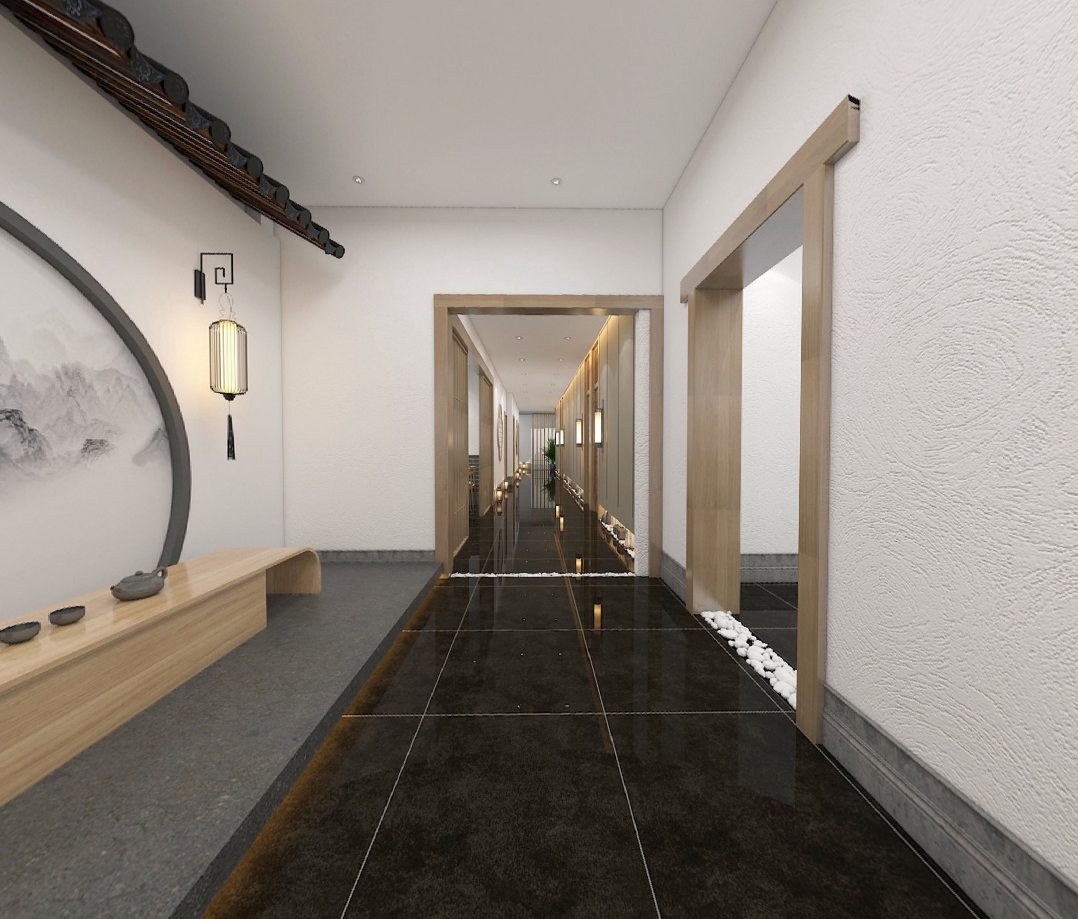 整体空间以白色,水磨石与铜三个材质为主要色调。简洁的白色衬托铜管的造型结构,水磨石材质由地面延到墙面腰线。入口处两侧向里卷曲的弧形水磨石,仿佛伸开双手欢迎顾客。