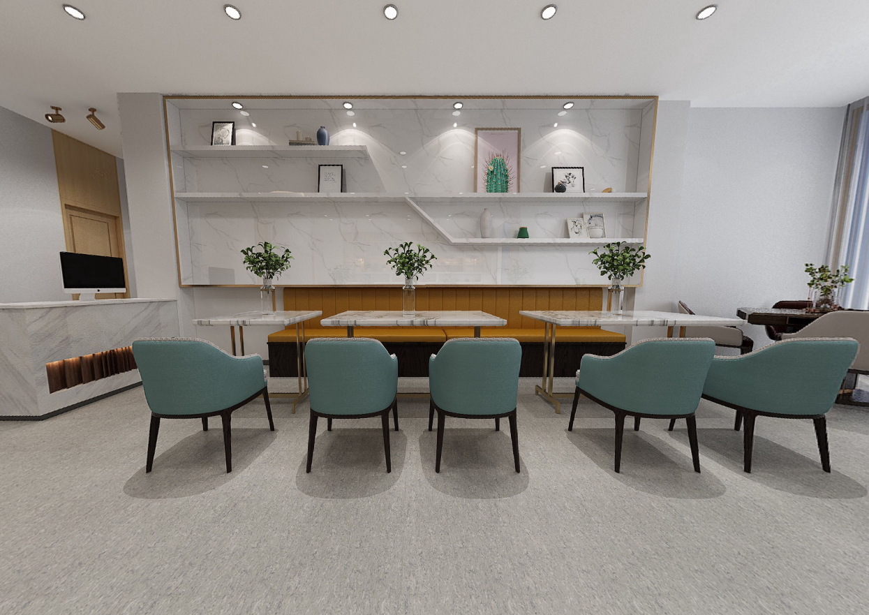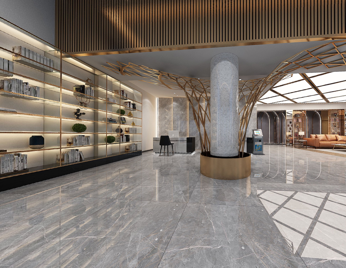 艺术装置,接待台对称均衡,沉稳而安静。金属材质的背景如同连绵起伏的山落,错落有章,空间的氛围把中式的水之禅意和当代艺术相结合,精致而简雅。