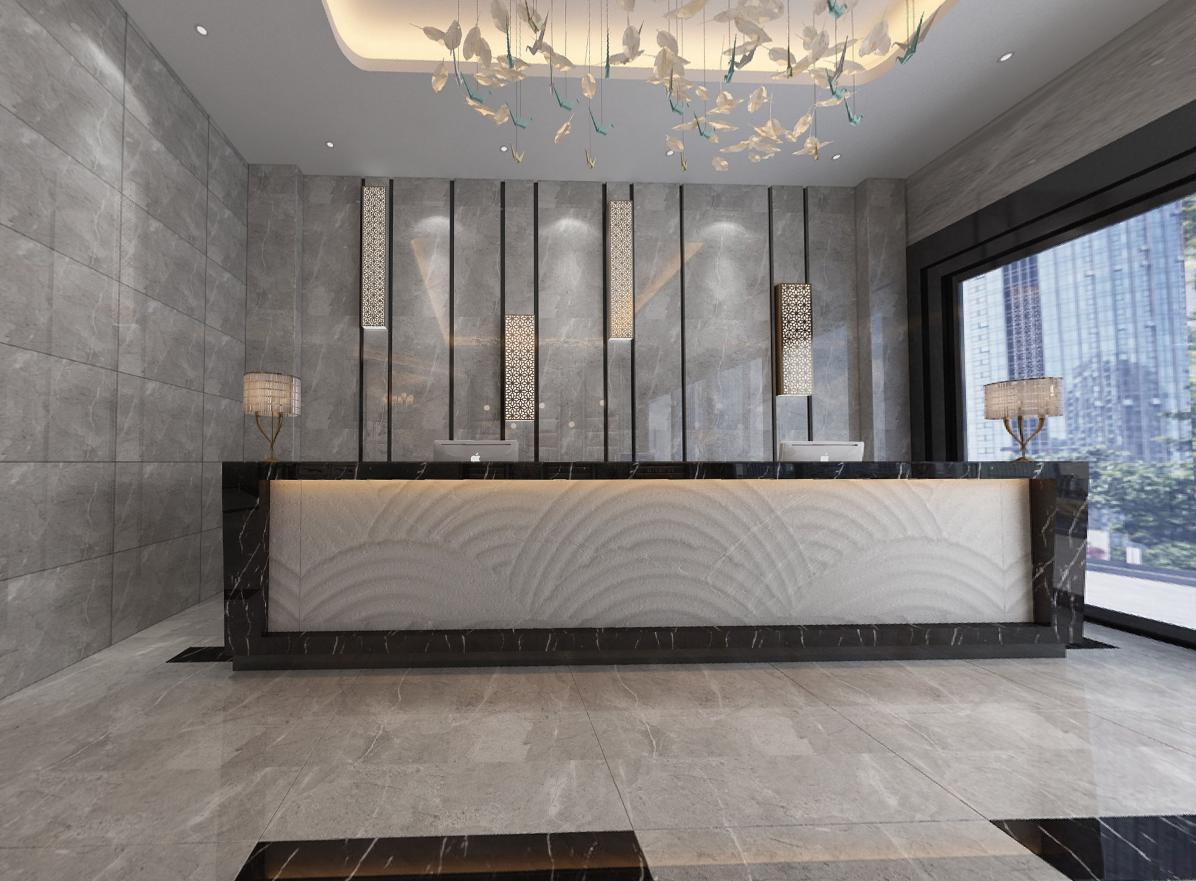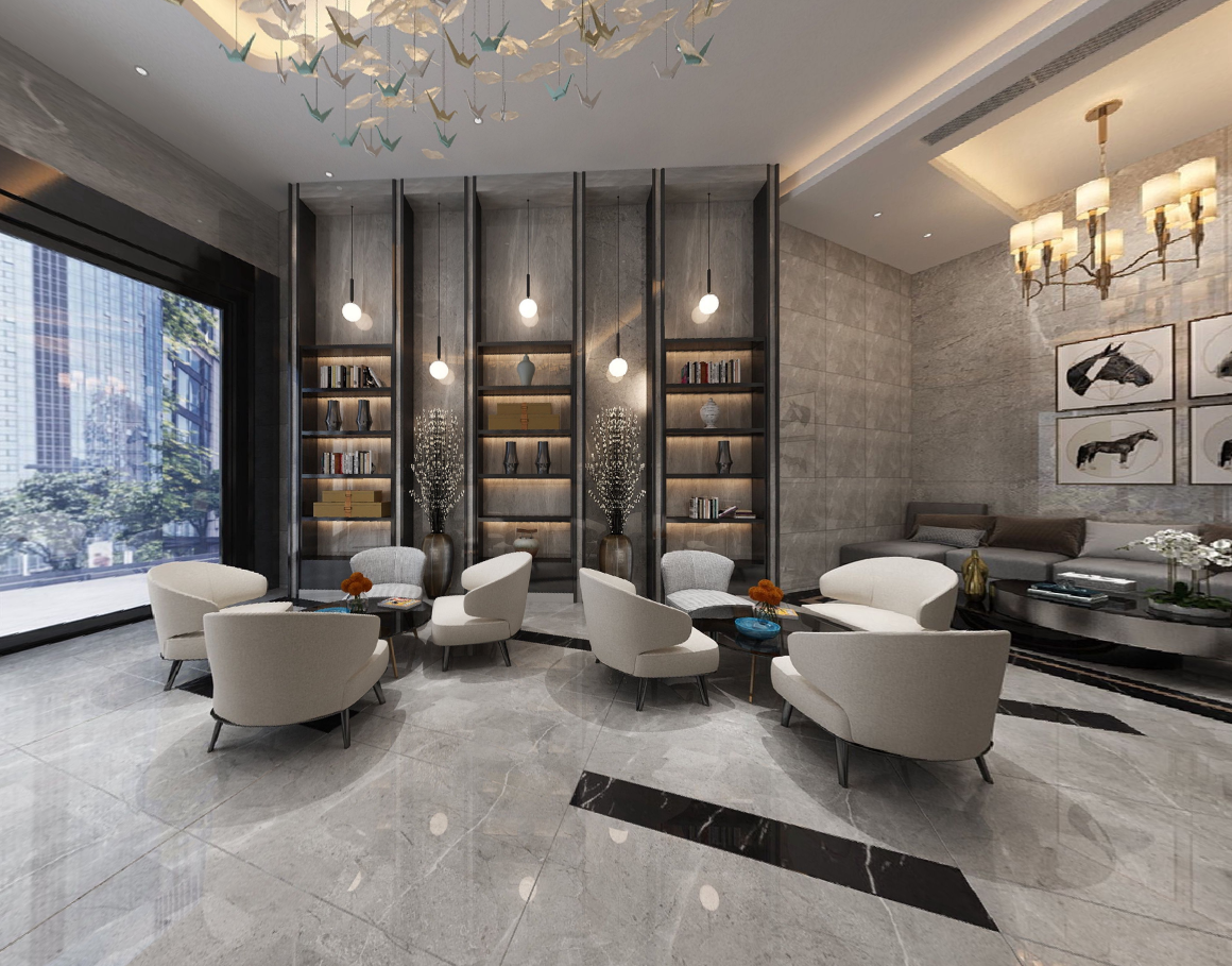 采用深色木材与细致青铜装饰而制的天花板圈围起整个空间,其独具特色的玻璃穹 顶为大堂引进自然光线,映照着一道中式石制圆弧形月亮门,分隔出大堂中庭与休息区的空间。