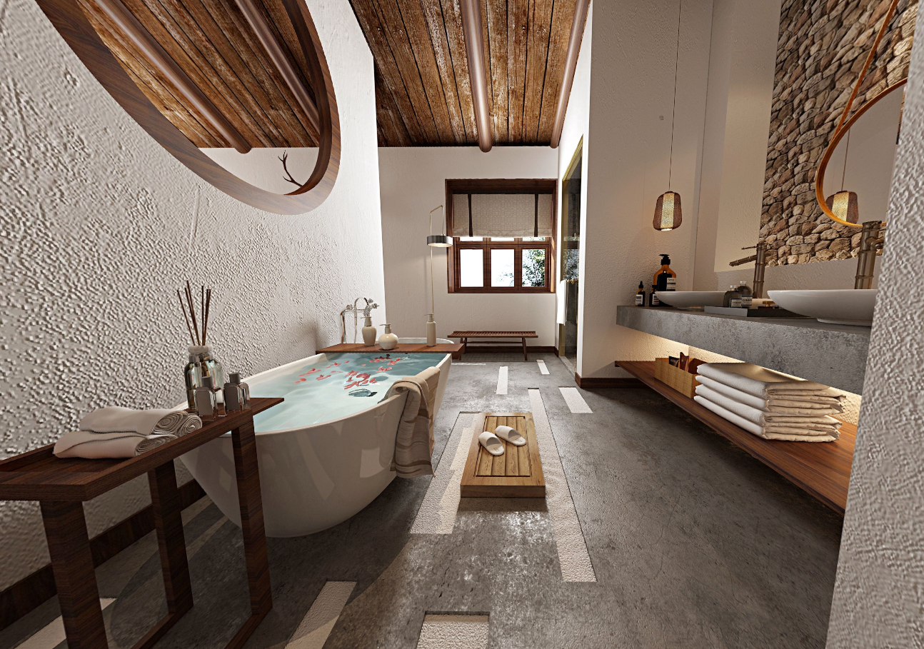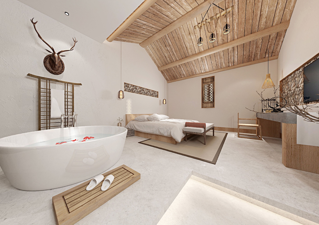 设计中将原本的房间全部打通,变成了全开放共享的空间。并将前台、休息区、吧台、厨房、餐厅进行了合理地功能区分,穿梭其中显得更加悠闲自在,并增强了交流。巨大的玻璃将室外别致的景色引入室内,提升了空间的趣味性,充满着生机与活力。