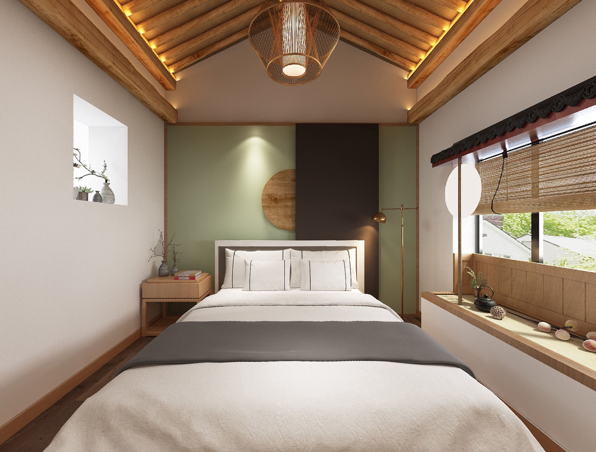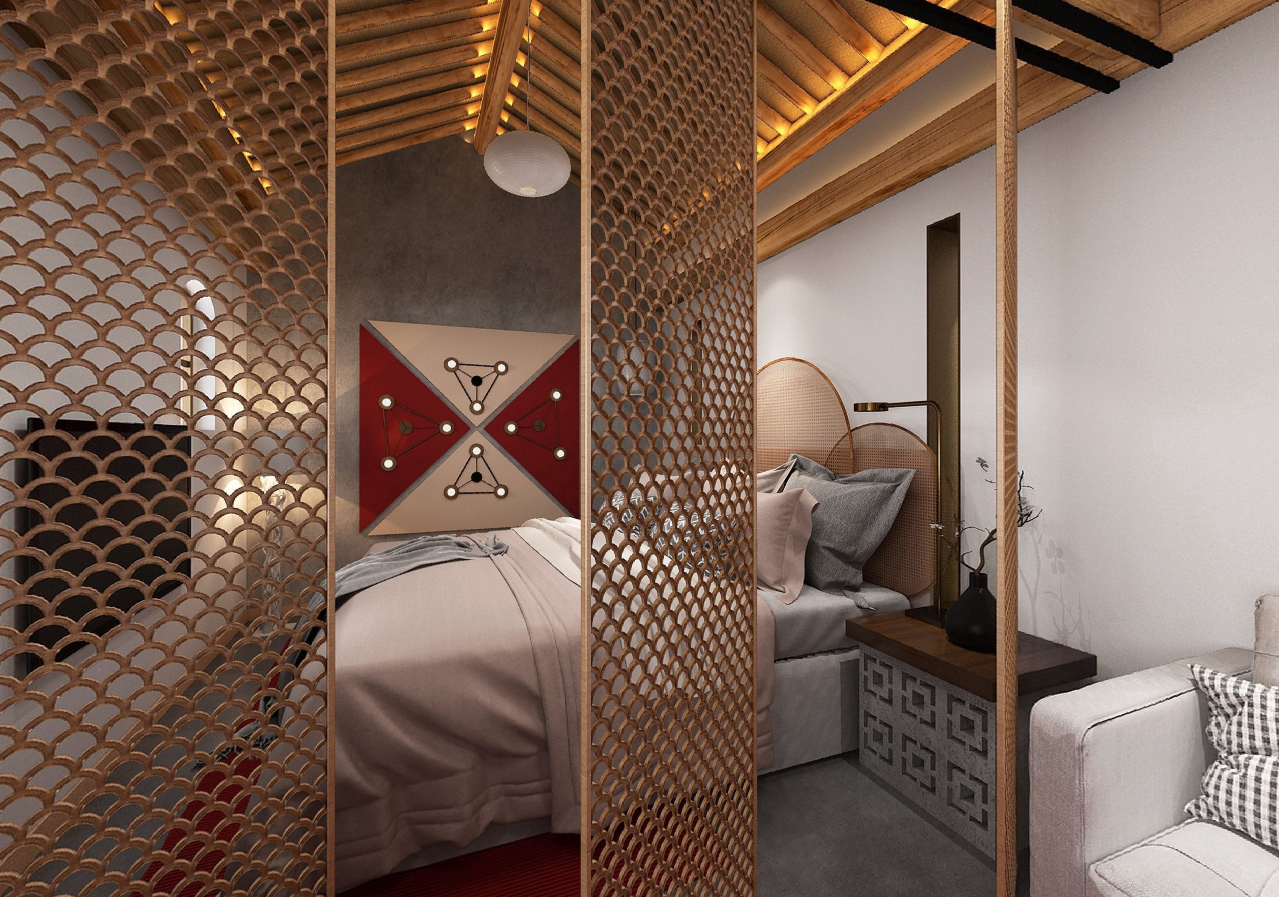 一层主要功能为接待茶室,其中一个茶室为了满足私密需求,采用夹藤玻璃的折叠门做为区隔。二层为餐厅,且在挑空位置增加了墙面开口,原本封闭的二楼与一楼空间产生了对话空间。三层为民宿示范套房,配置卧室及客厅,可以满足私人接待及小型会议功能。