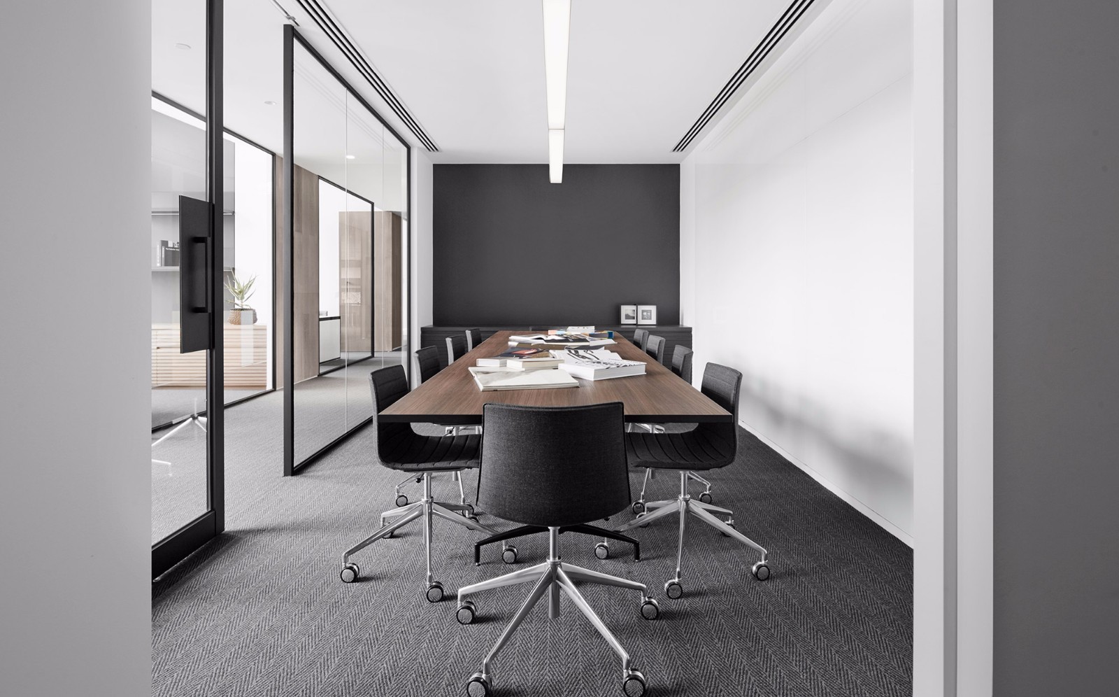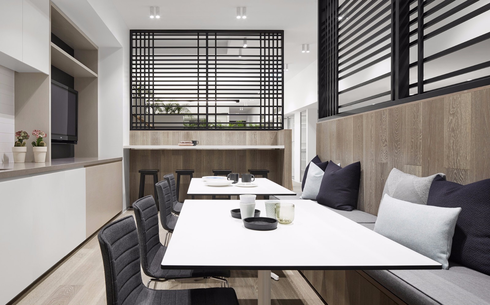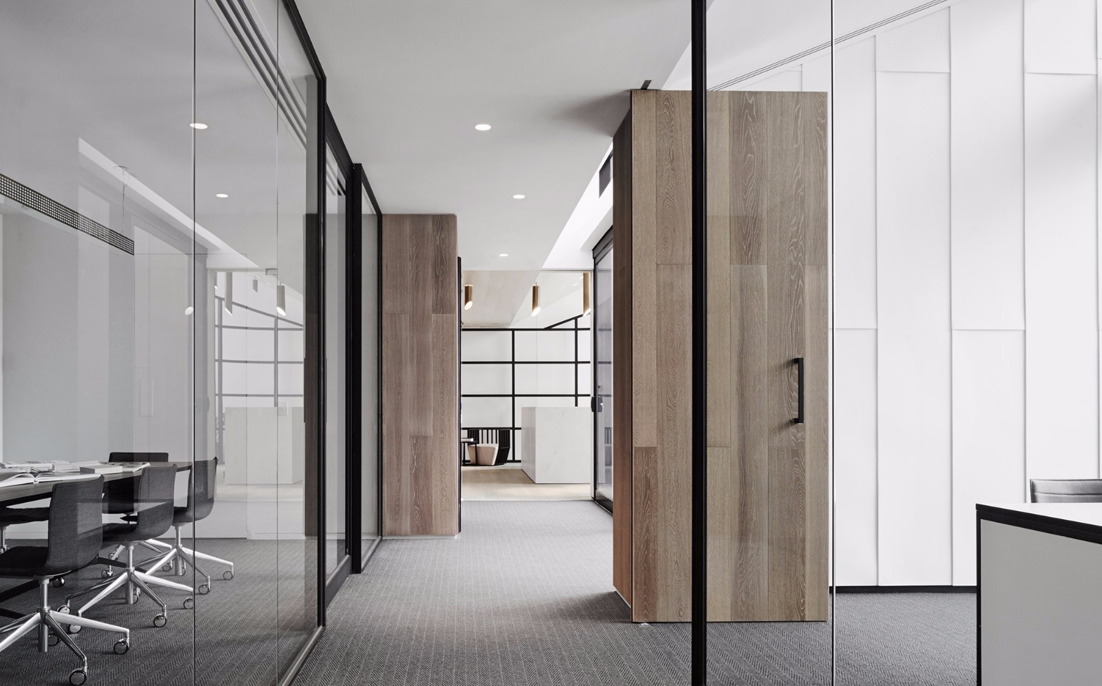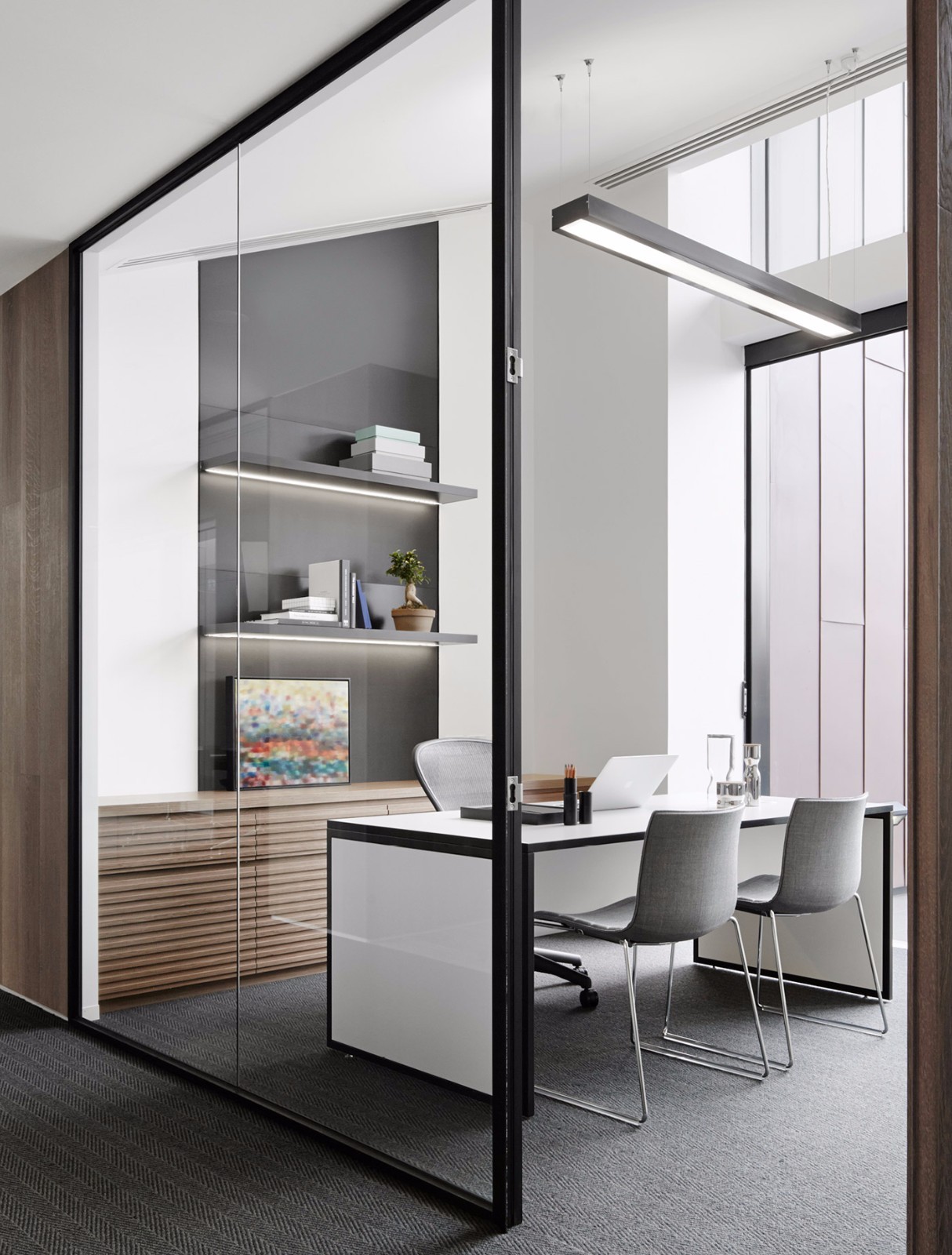 干净的建筑线条创造了大比例的感觉,而一系列相关的黑色框架突出了这些分区,提供了私密性和不同工作人员分区。
