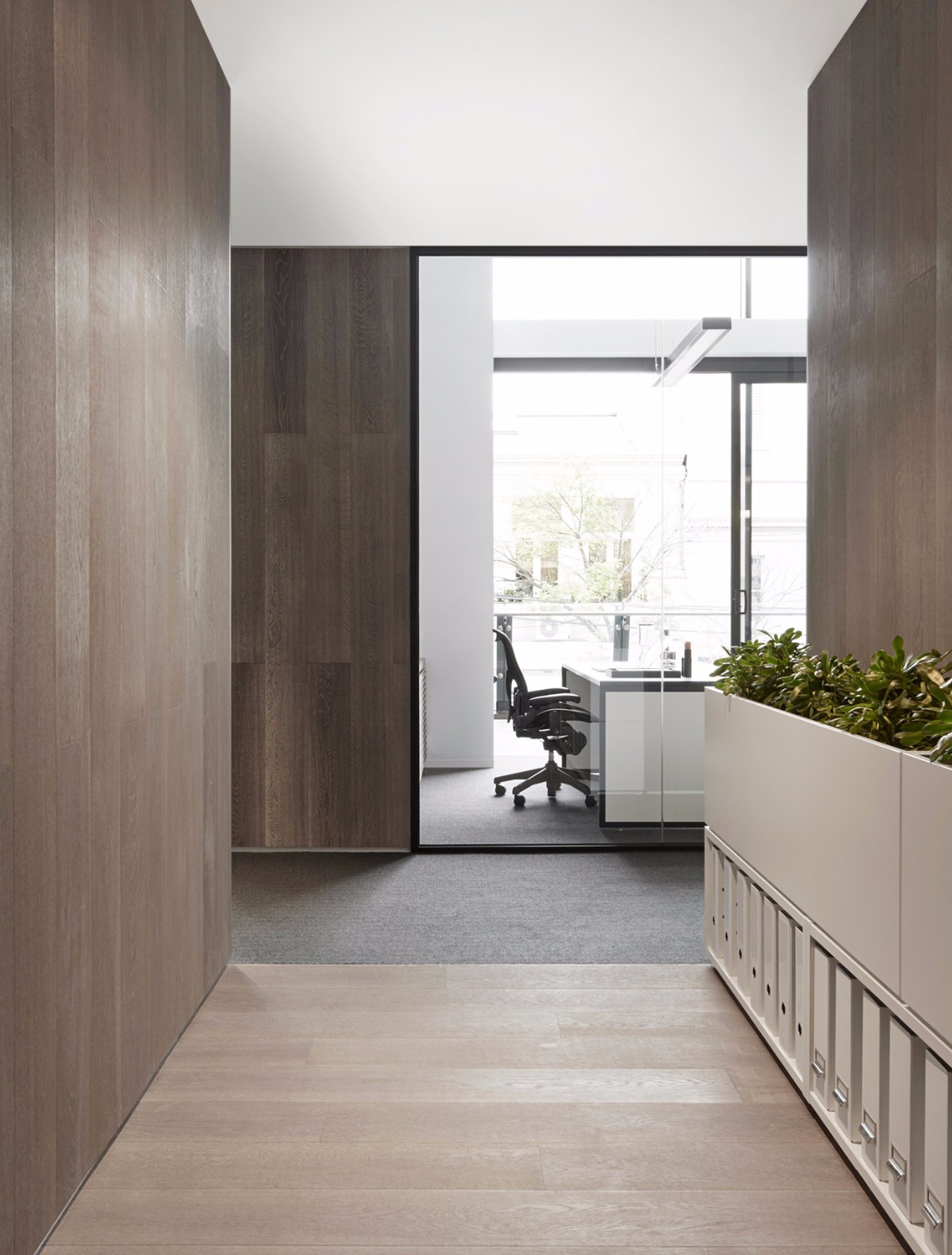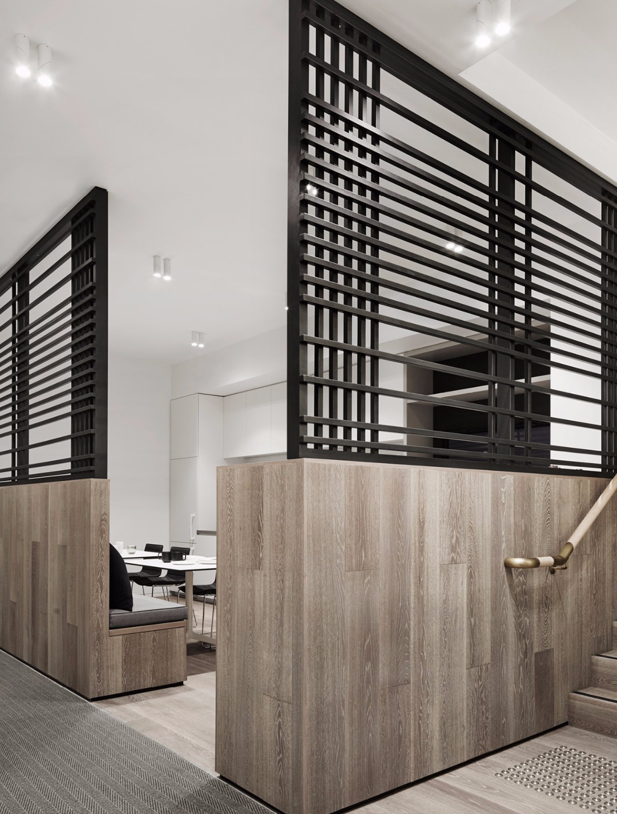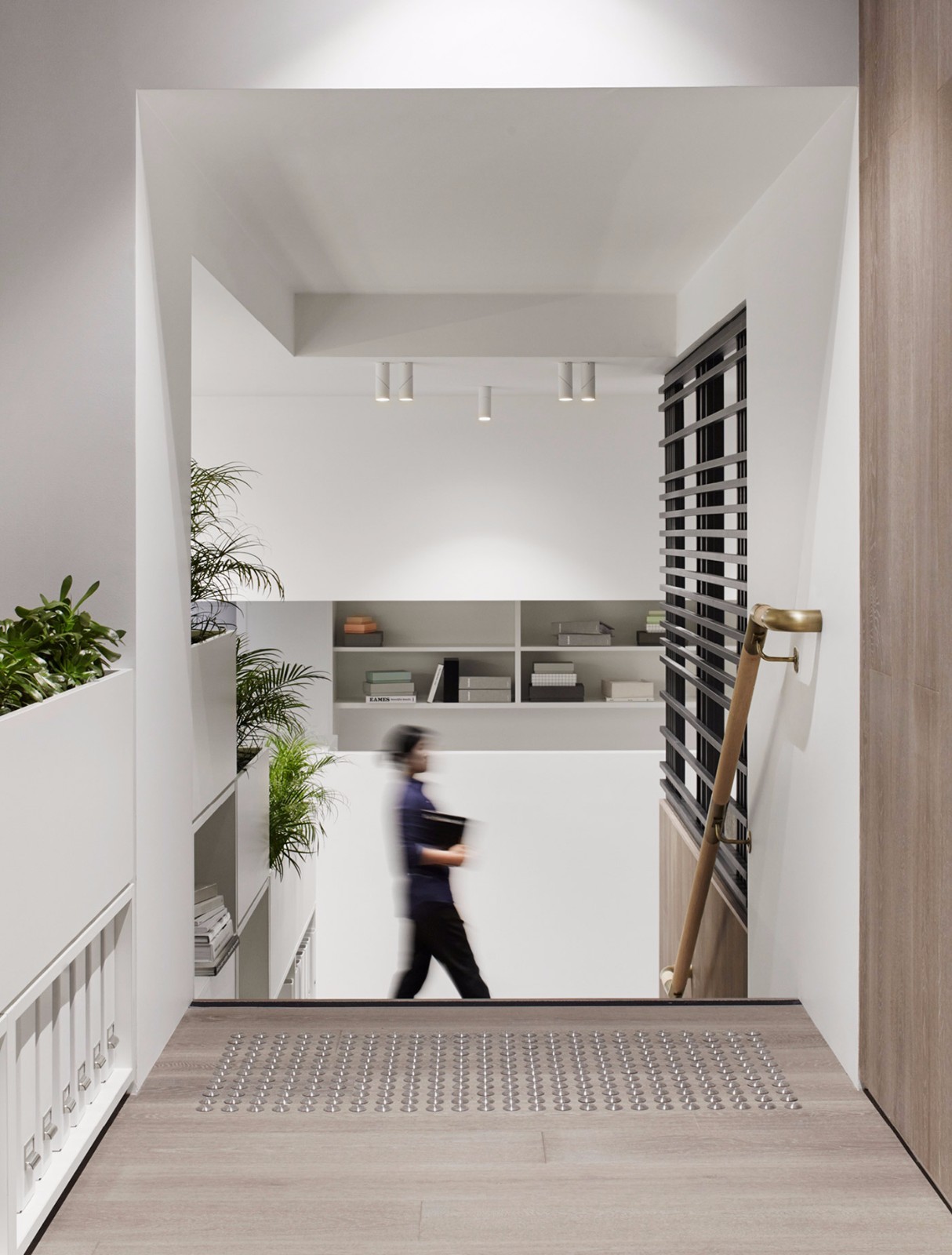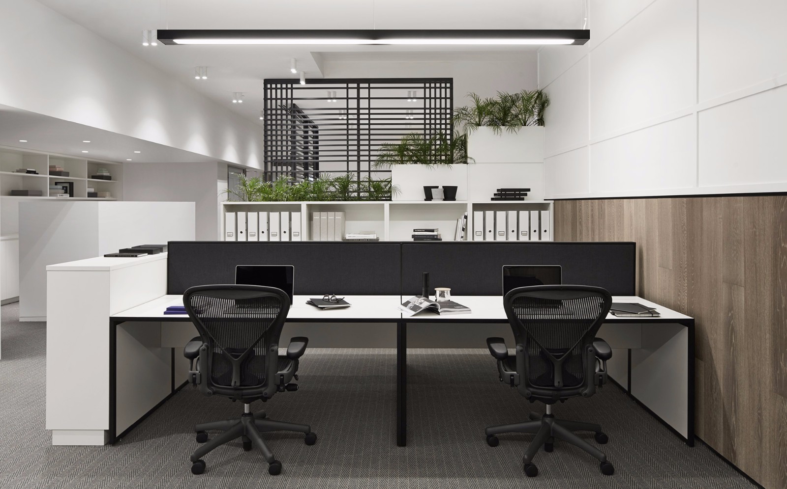 干净的建筑线条创造了大比例的感觉,而一系列相关的黑色框架突出了这些分区,提供了私密性和不同工作人员分区。