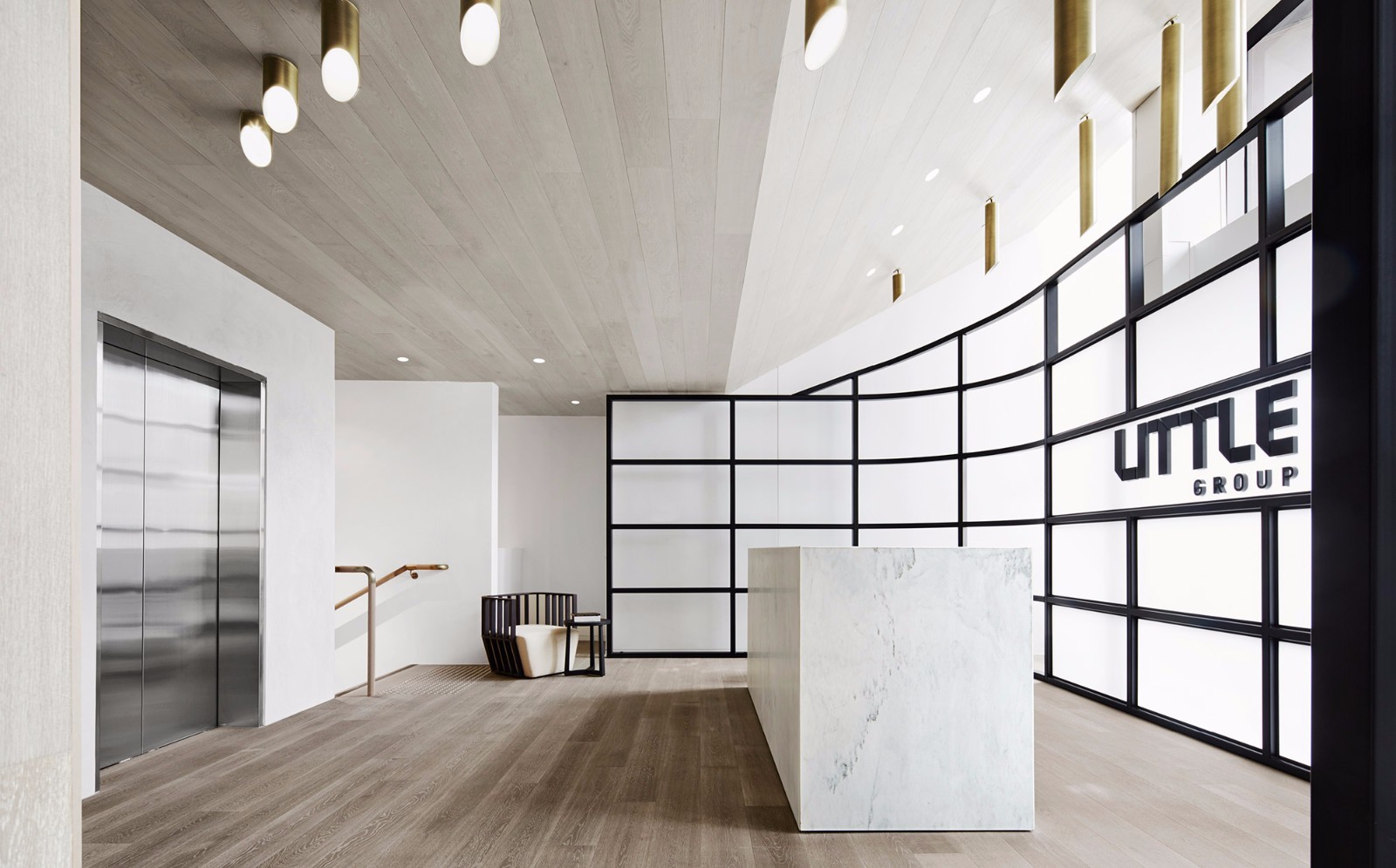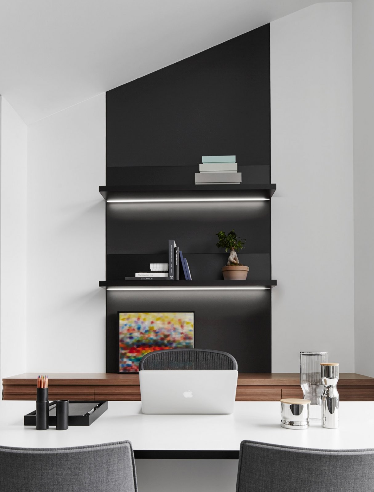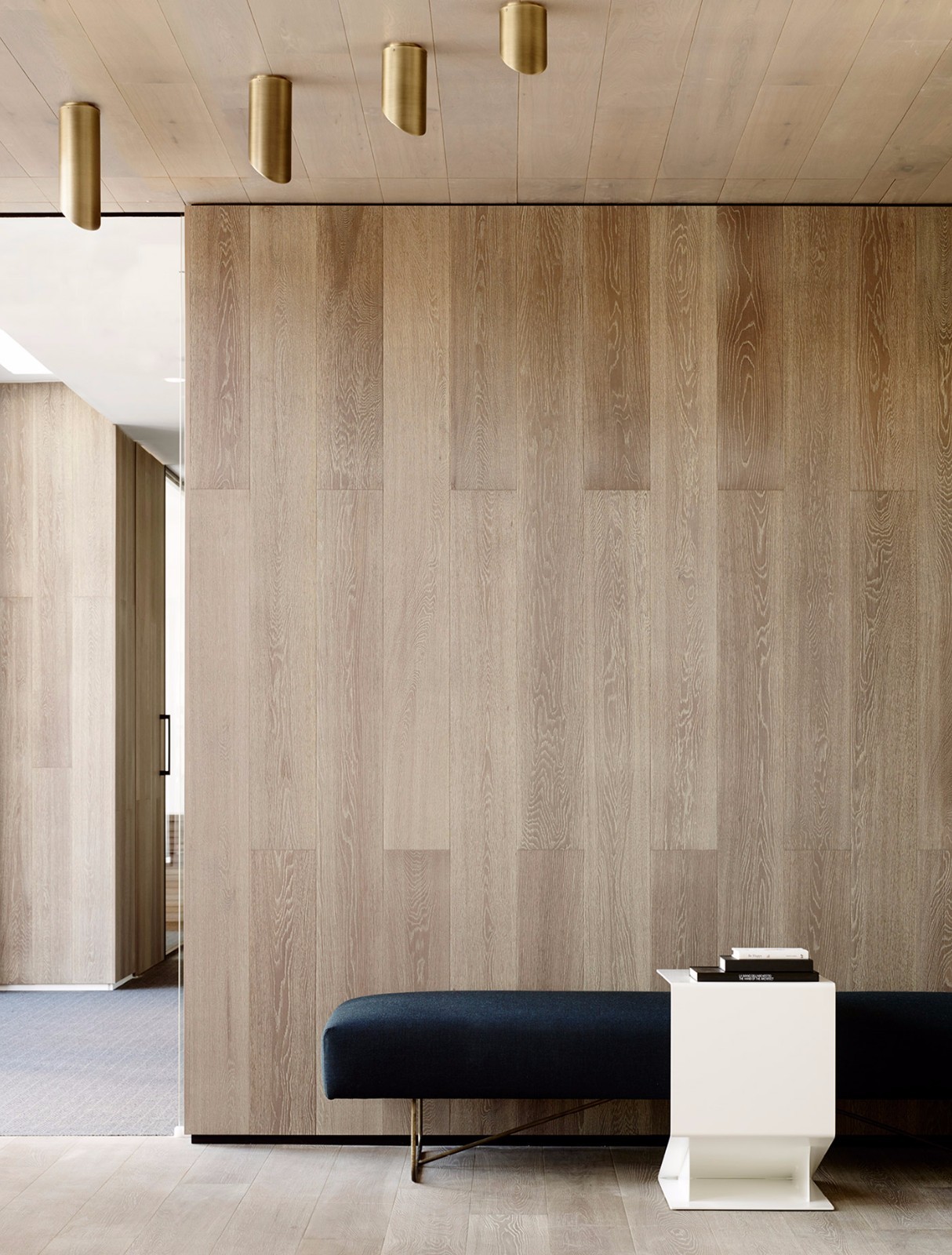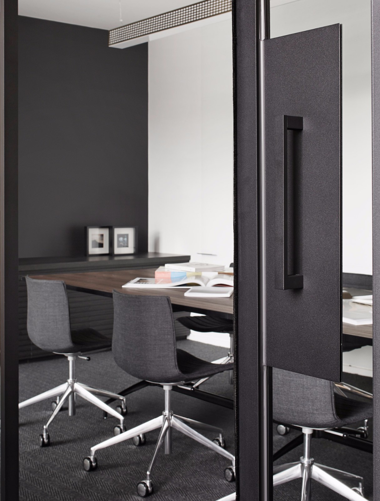 干净的建筑线条创造了大比例的感觉,而一系列相关的黑色框架突出了这些分区,提供了私密性和不同工作人员分区。