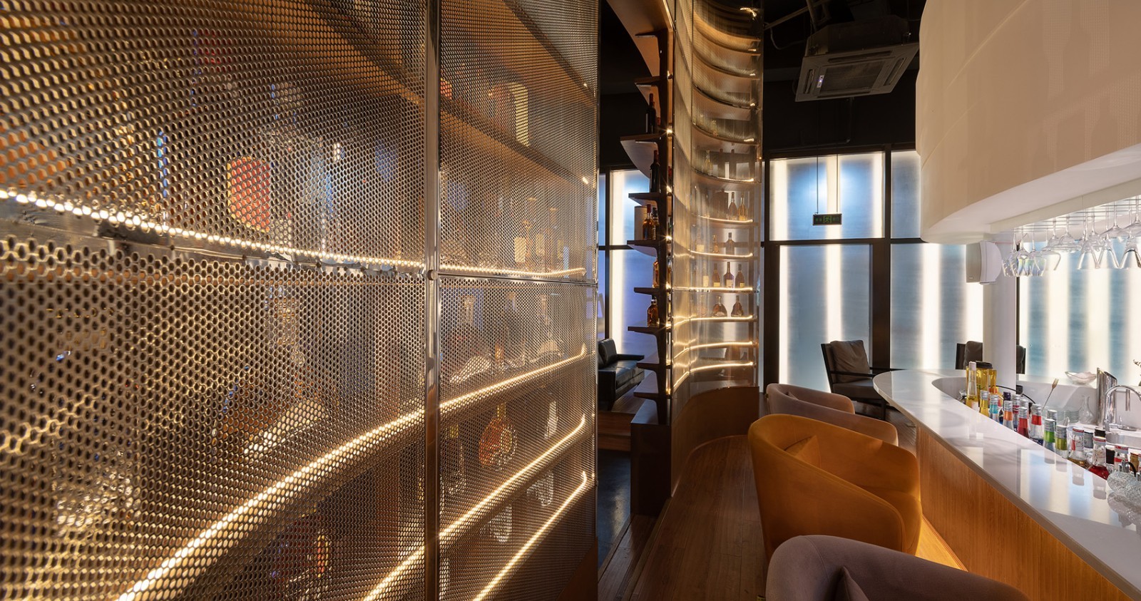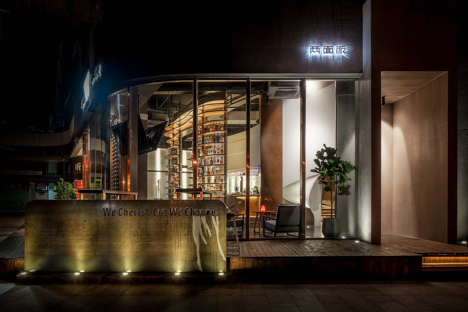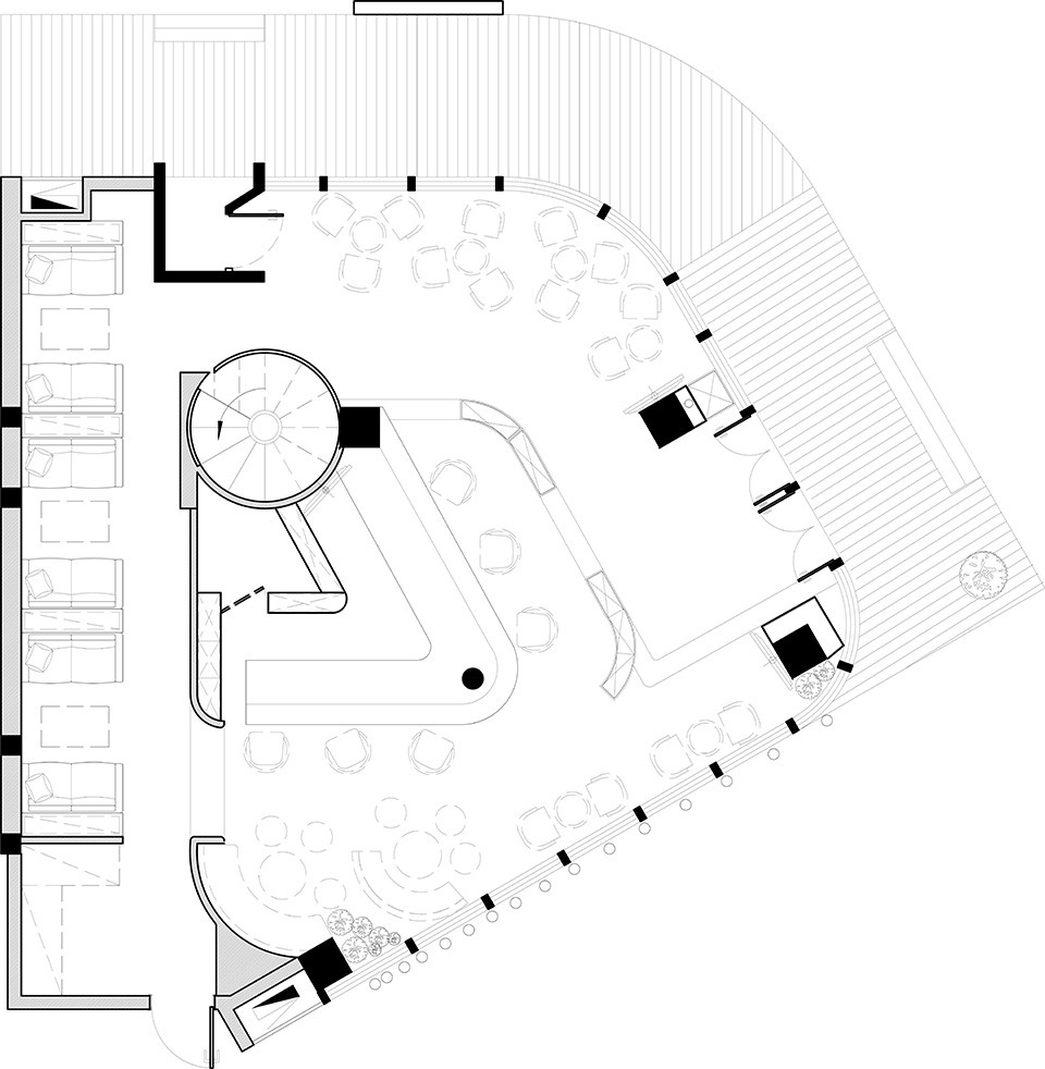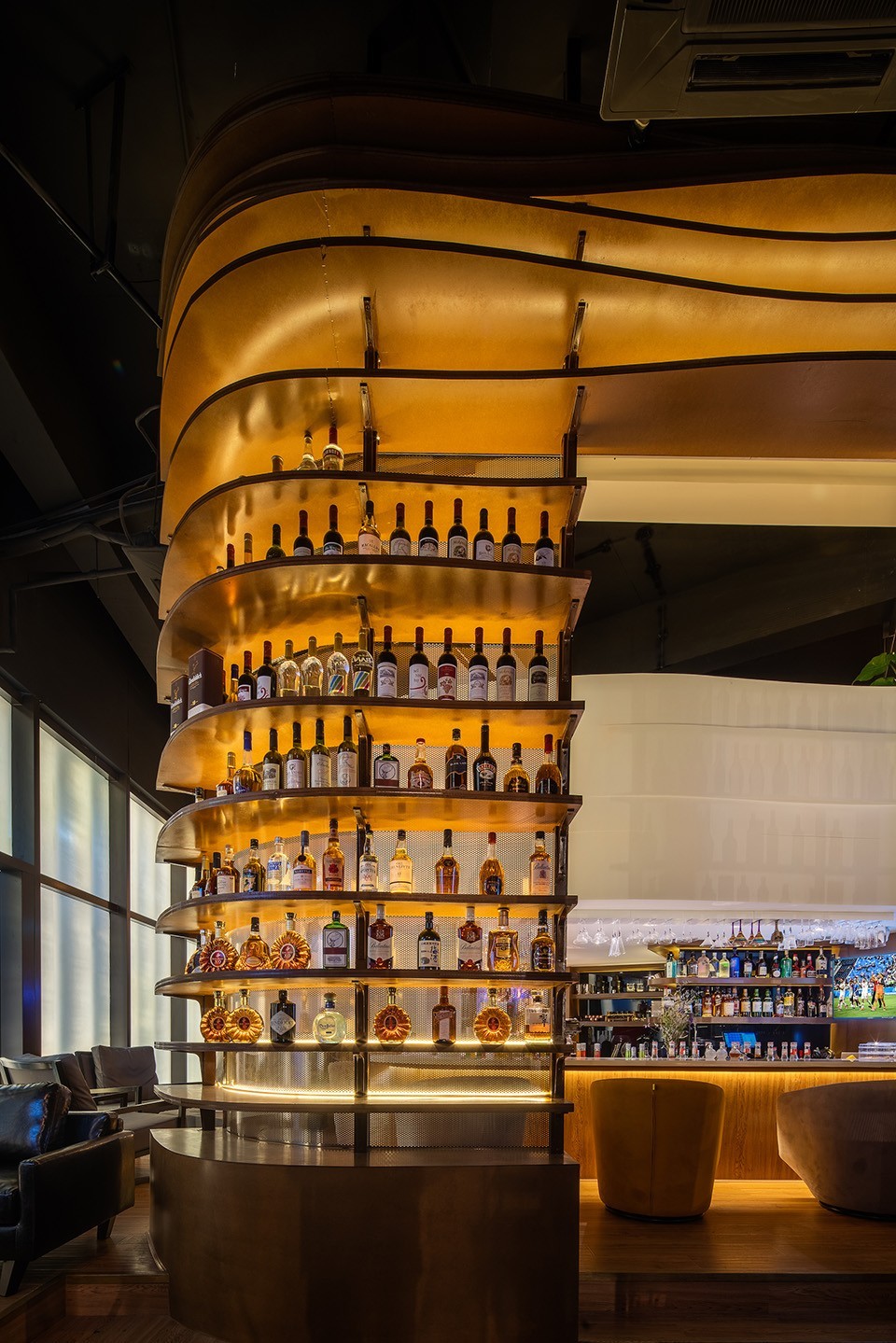 设计师以吧台为核心和原点,将空间分割成不同的功能区域,同时利用层高的优势在吧台上方设立私密夹层,具有雕塑感的白色双螺旋楼梯则是连接上下的纽带;透过落地玻璃