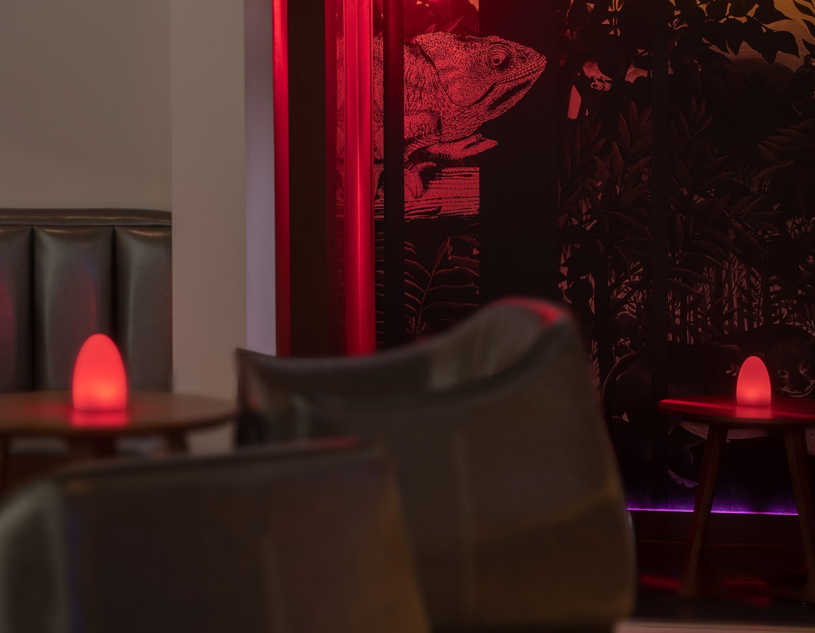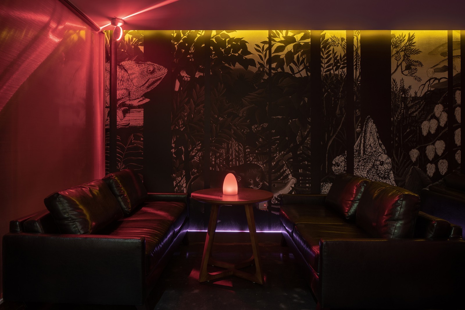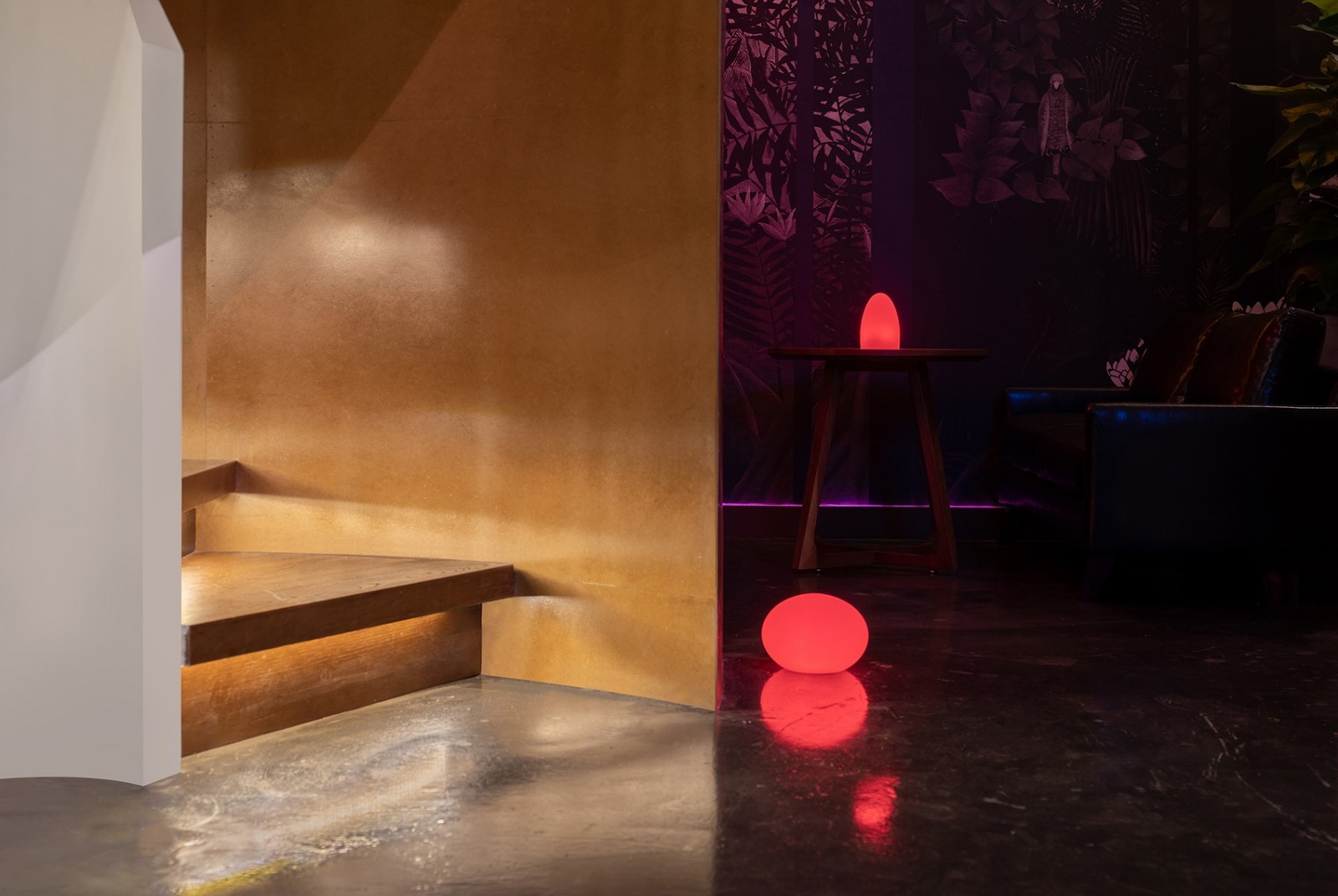 设计师以吧台为核心和原点,将空间分割成不同的功能区域,同时利用层高的优势在吧台上方设立私密夹层,具有雕塑感的白色双螺旋楼梯则是连接上下的纽带;透过落地玻璃