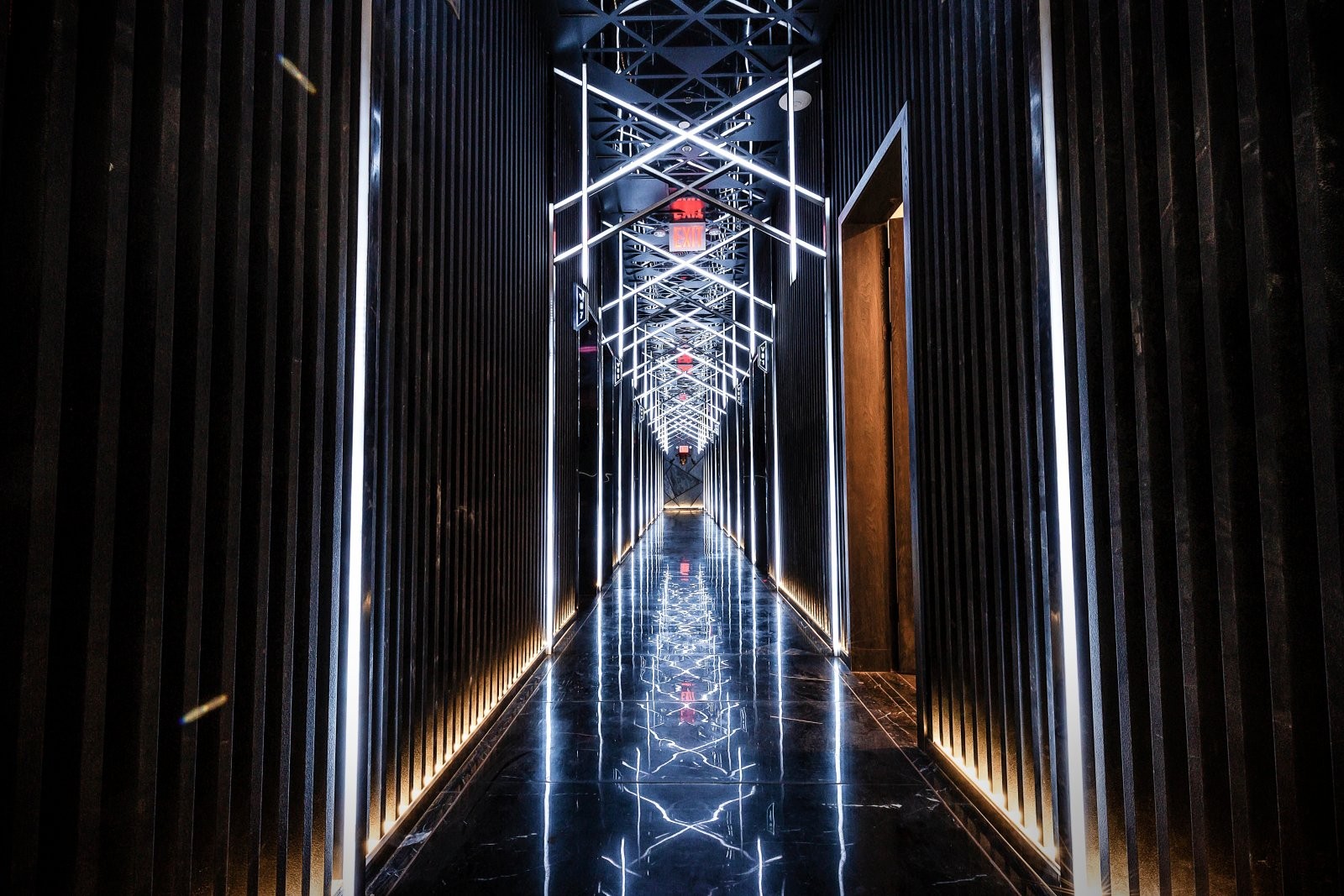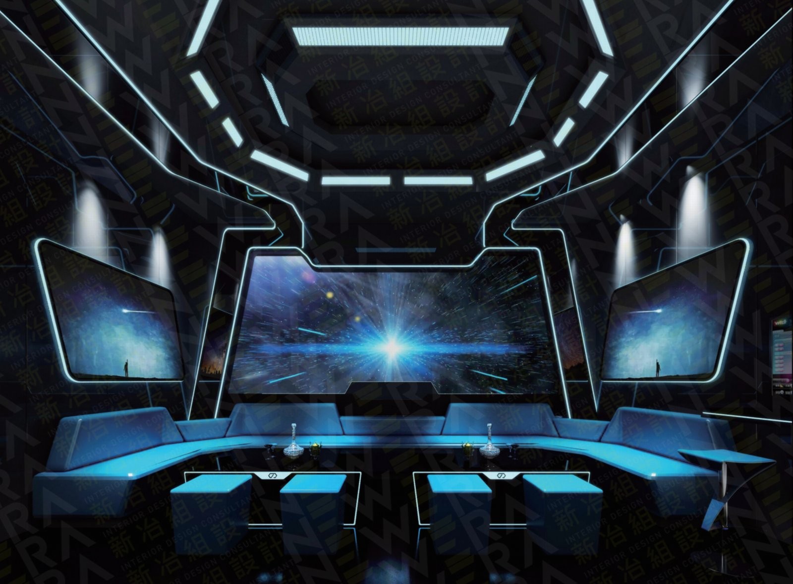 新冶组打破传统走道空间的设计做法,在设计细节上,如空间线条的连续性、空间的转折、空间中灯光的运用,都加入了科幻元素,打造超维度空间的时光隧道感,穿过即抵达娱乐新空间。